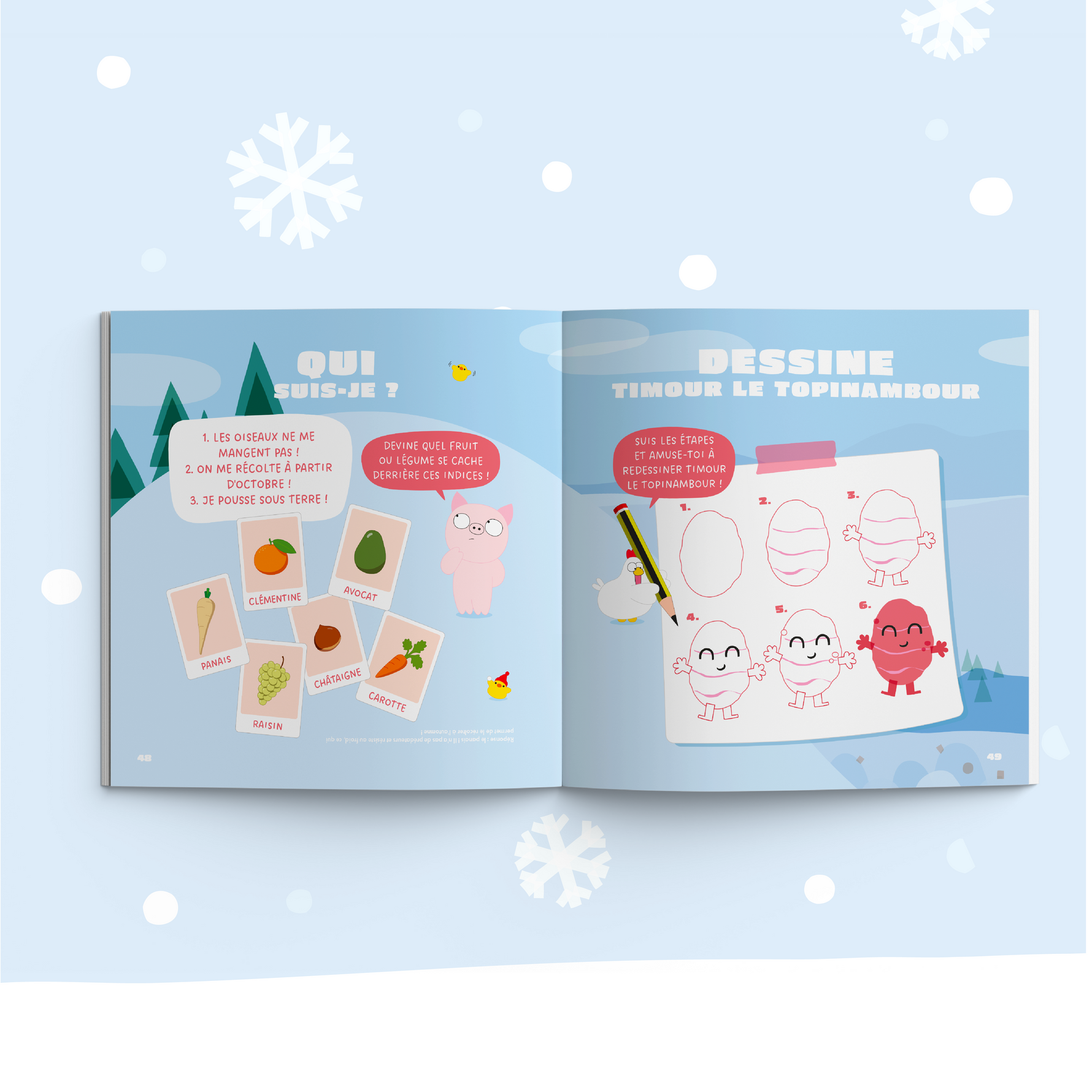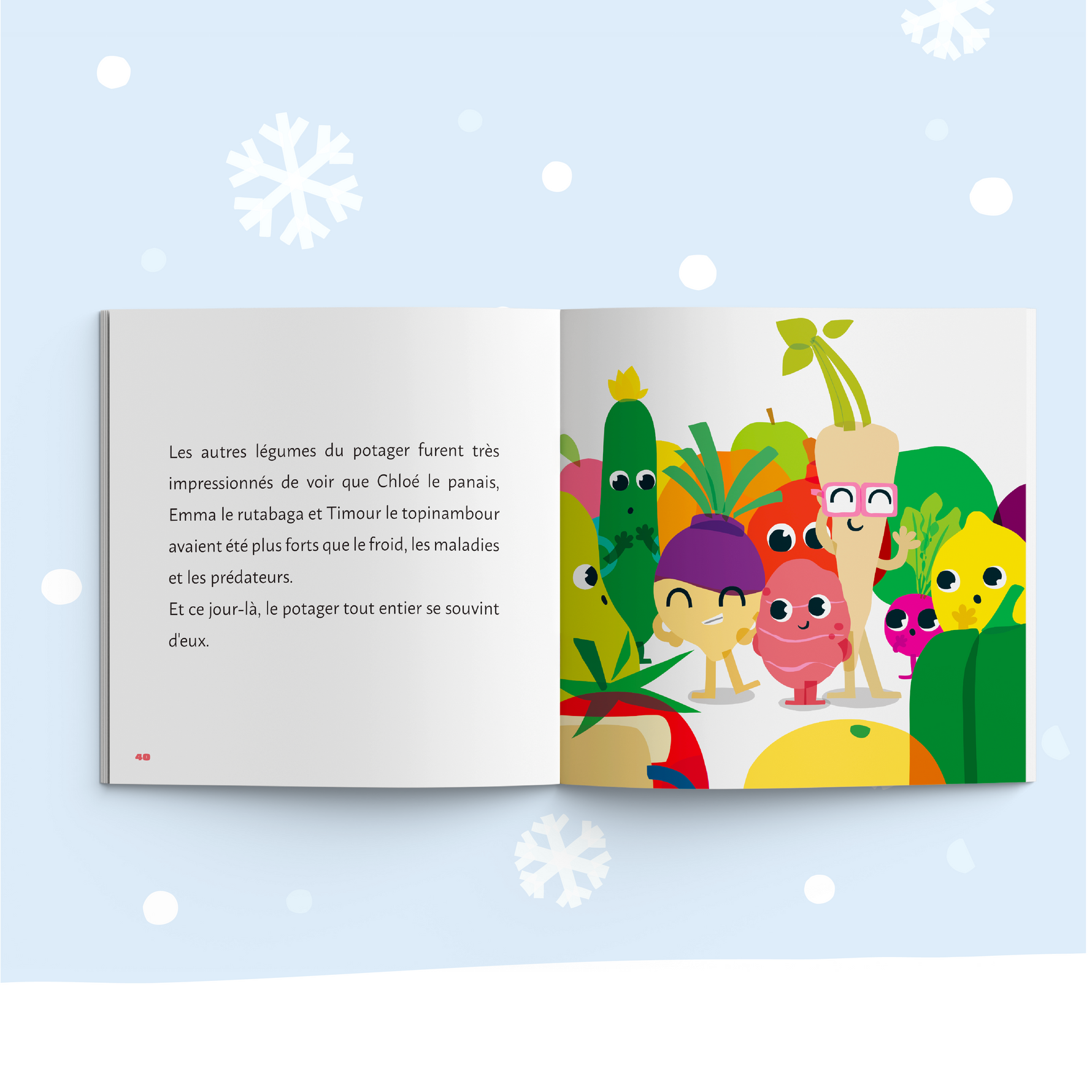 Timour le topinambour est un légume oublié. On l’oublie tout le temps ! Quand une vague de froid s’abat sur le potager, tous les légumes partent vers le sud pour se réchauffer, sauf Timour, qu’on a encore oublié. Alors qu’il pense être seul au potager, on frappe à sa porte… Timour s’apprête à vivre un hiver inoubliable !