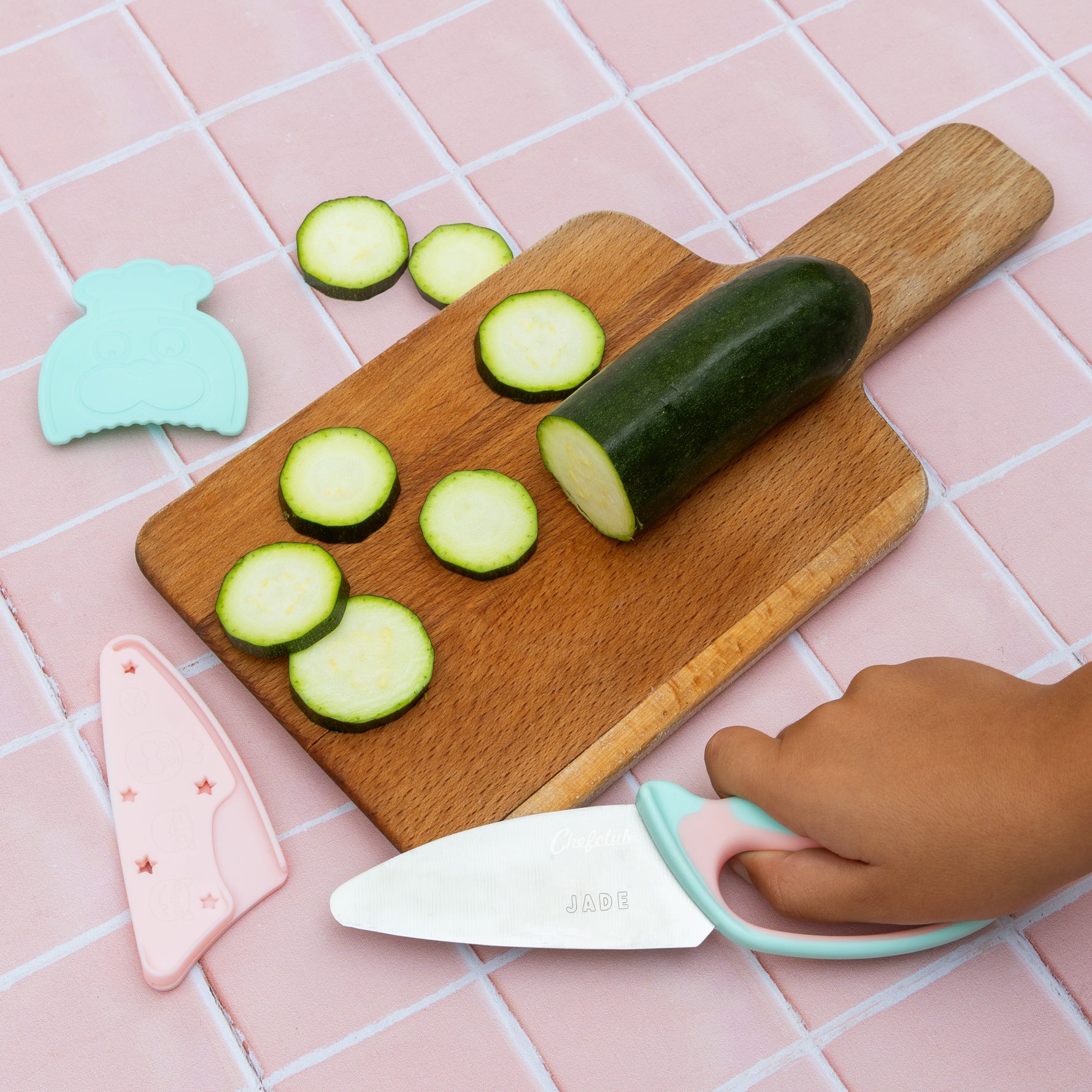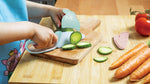 Notre promesse, c'est un couteau qui coupe les ingrédients mais pas les doigts ! La poignée est inspirée d'une paire de ciseaux pour enfant, adaptée tant pour les gauchers que pour les droitiers. La sécurité de l'autre main est assurée par le protège doigts, pour assimiler les réflexes des chefs et éviter tout dérapage