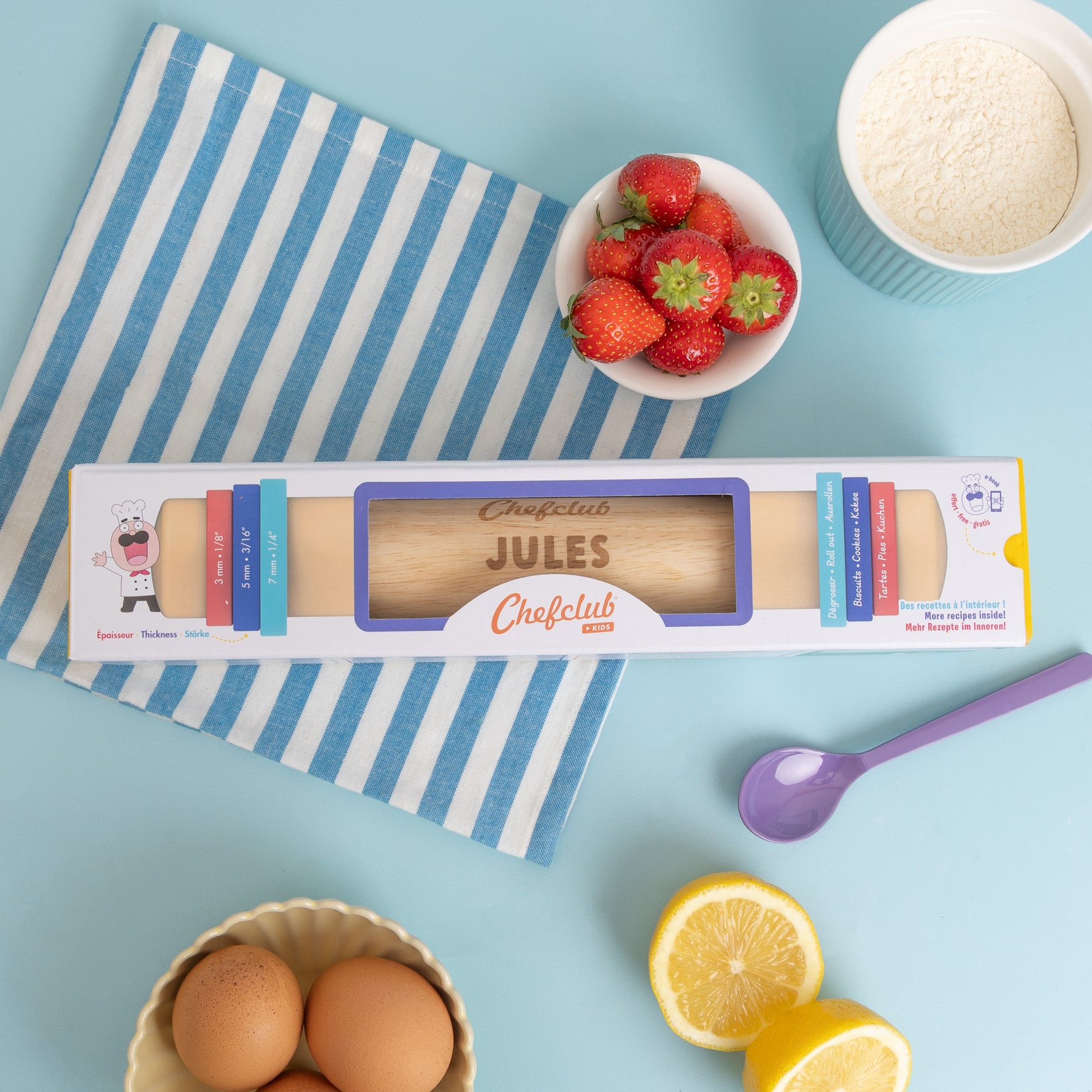 Personnaliser dès à présent le rouleau Chefclub Kids, qui fonctionne avec un système d'anneaux amovibles pour gérer l'épaisseur des pâtes. Choisissez ensemble votre recette, installez les anneaux adaptés et maîtrisez l'art d'étaler votre pâte à la perfection !