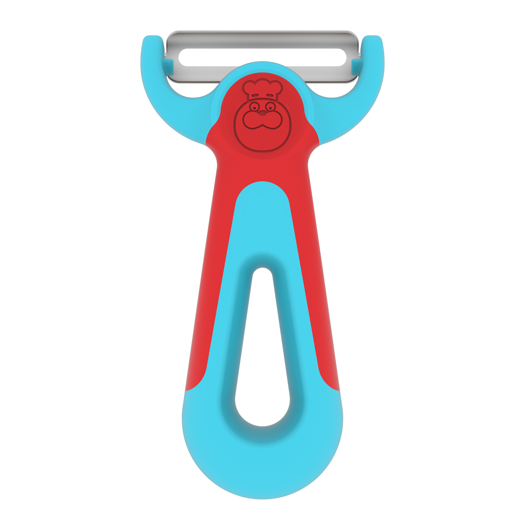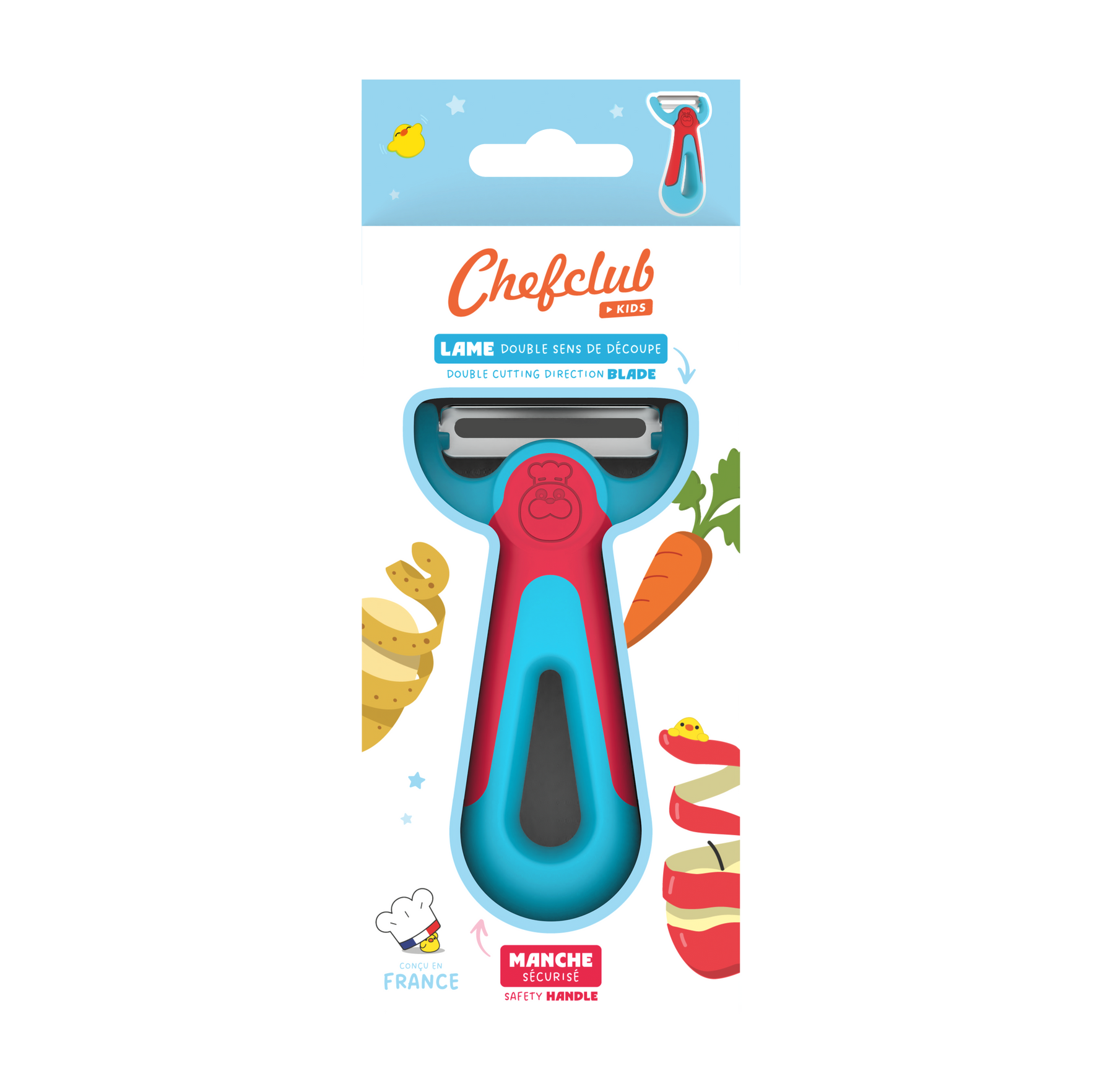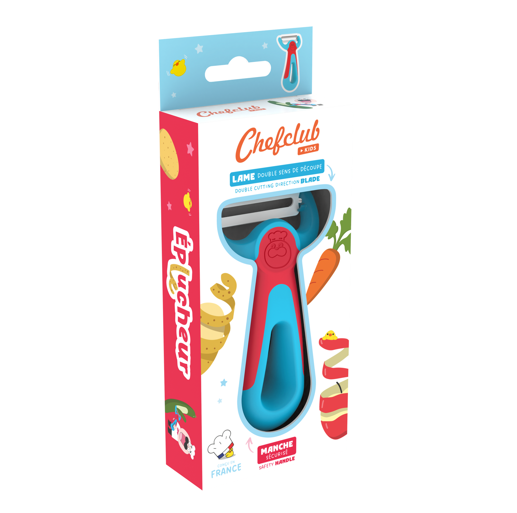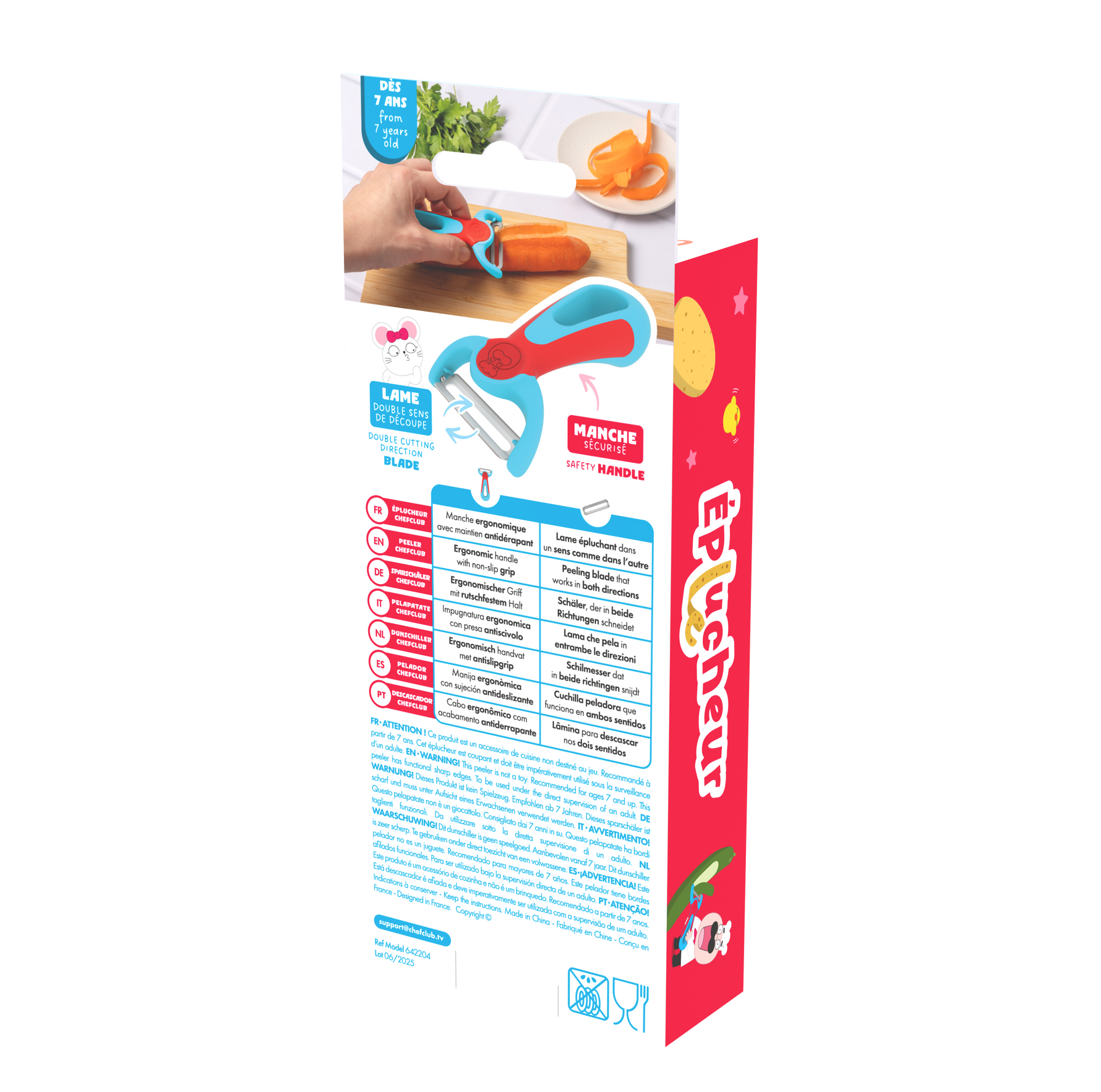 Après le couteau du chef, place à l’éplucheur Kids, spécialement conçu pour les petites mains. Sa forme ergonomique et son manche anti-dérapant offrent une prise en main sûre et confortable pour éplucher en toute sécurité. Sa lame bidirectionnelle permet d’éplucher les fruits et les légumes dans les deux sens, ce qui facilite l’action et rend le geste plus fluide et naturel. Un outil donc indispensable pour initier les enfants à la cuisine en toute autonomie !